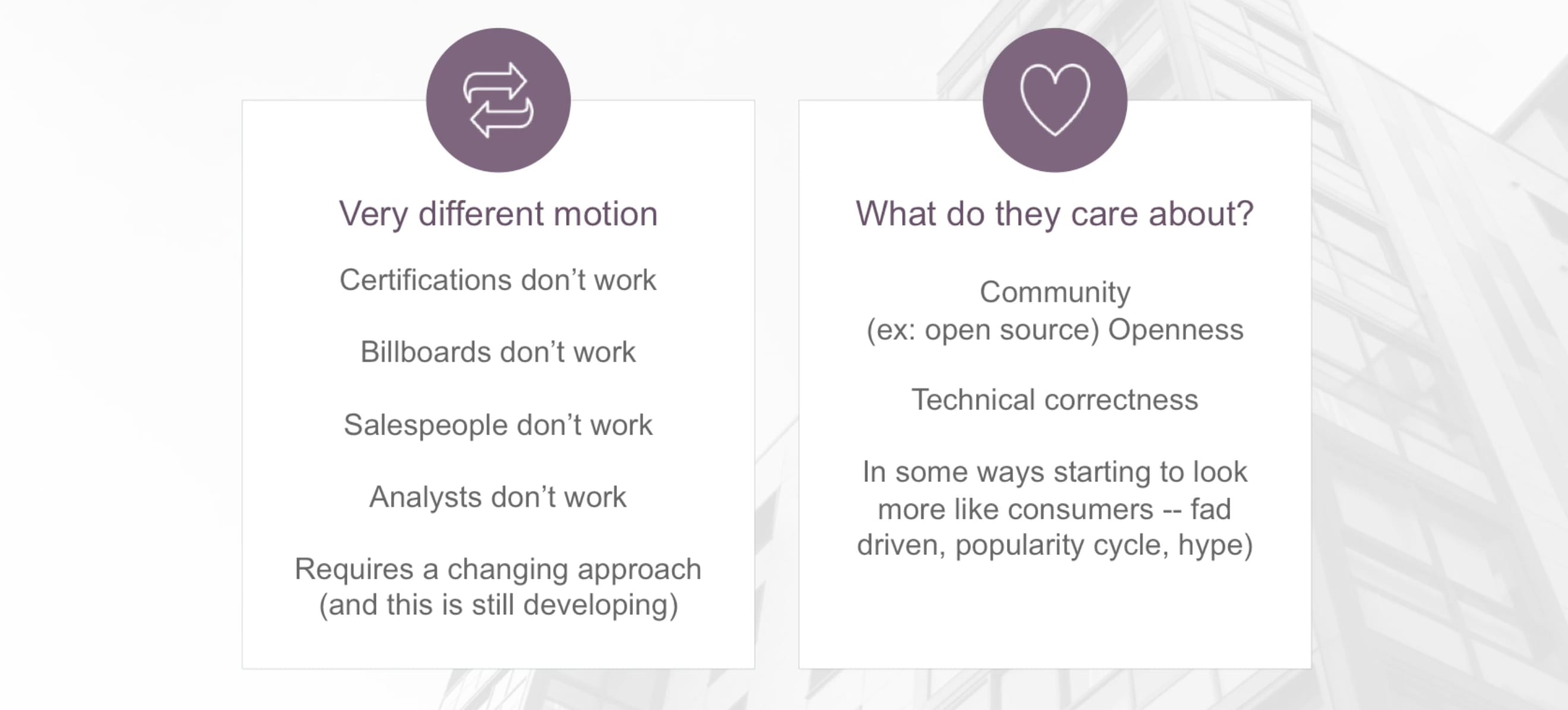 All of that’s changing right now, because developers are influencing budget more than ever. And they’re changing in a way that’s really beneficial to you. They’re way more technical. They don’t care about these relationships. They like to consume things on more of an Amazon-like basis. They actually don’t care as much about analysts. They definitely don’t have the same relationships with the box seats or the nice dinners. It’s a very different buyer.