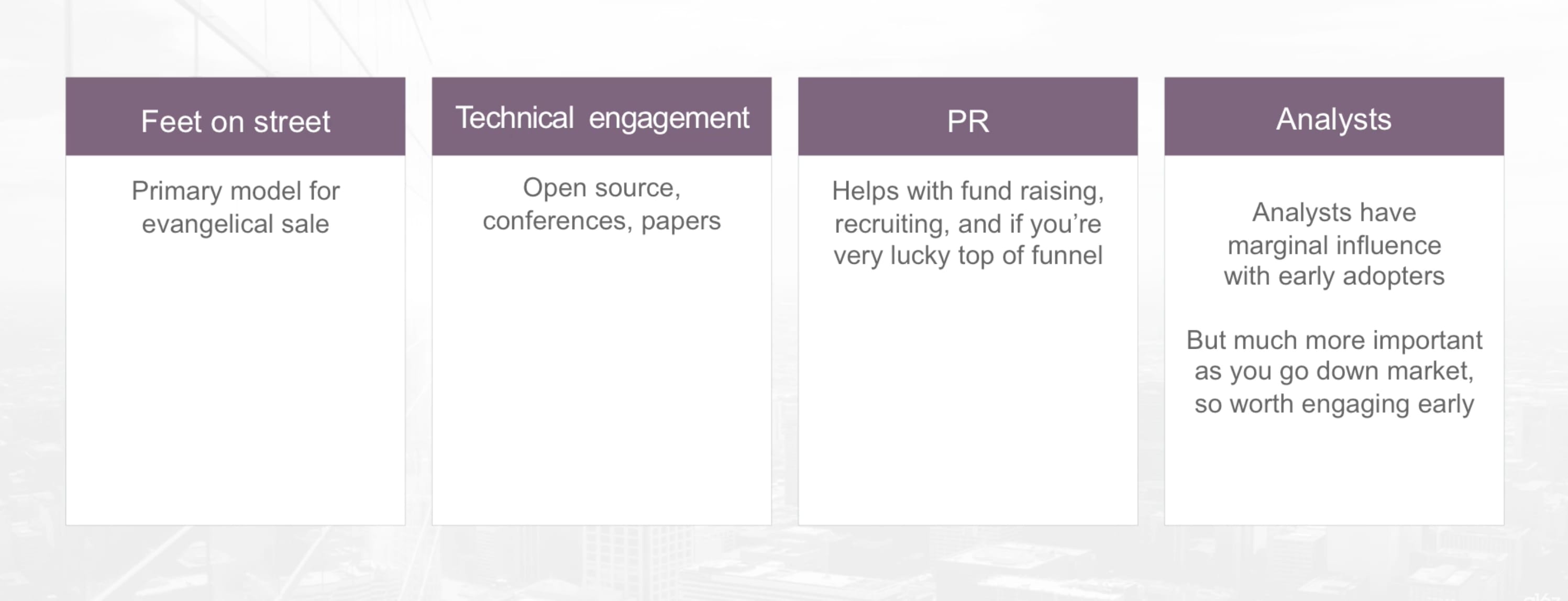 Analysts actually are very important. It’s interesting: when you’re dealing with the early adopters, they don’t really listen to analysts because they’re often kind of Wild West and they’ll engage with you directly. But as soon as you go down market, Gartner’s really important. Believe it or not, you have to do your own market category creation with Gartner. I always thought it was really ironic: the first time you talk to Gartner about your idea, they don’t know what it exists. So it’s this kind of mini assault that you have to do in order to get them to agree, and then they’ll affect buying motions.