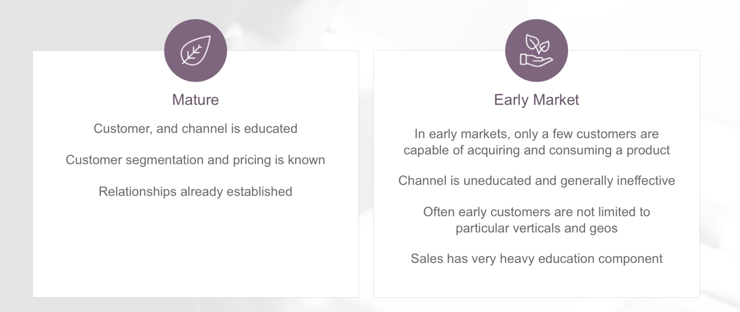A common mistake, and one that I made many times, is to think that sales is sales. Early market sales is different from mature market sales. And the people that do well in early market sales are often very different from people that do well in mature market sales. And the reason is it’s just a different motion.