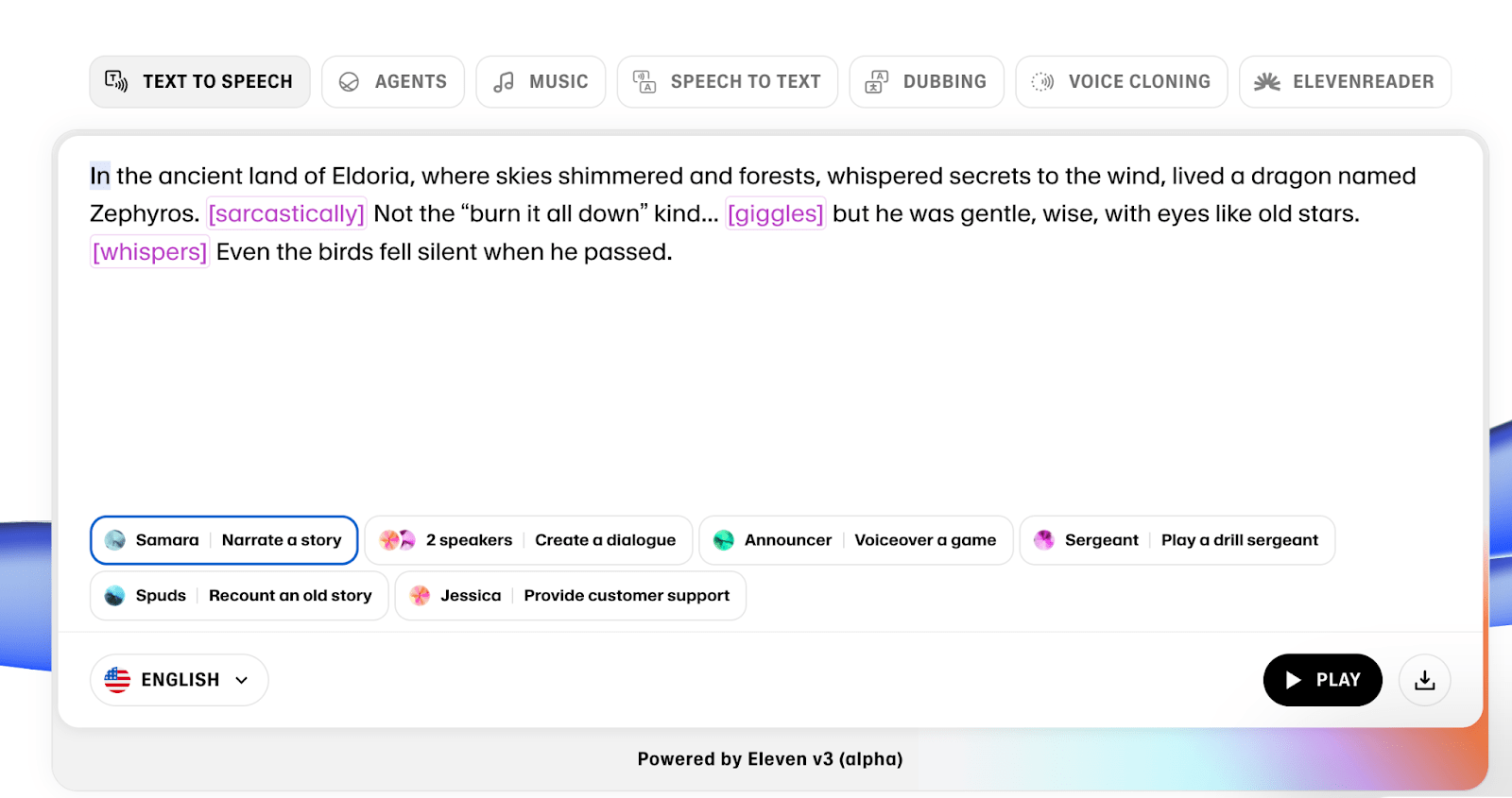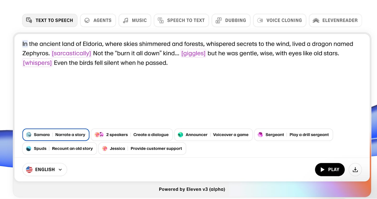 ElevenLabs allows users to specify emotion, tone, volume, and language.