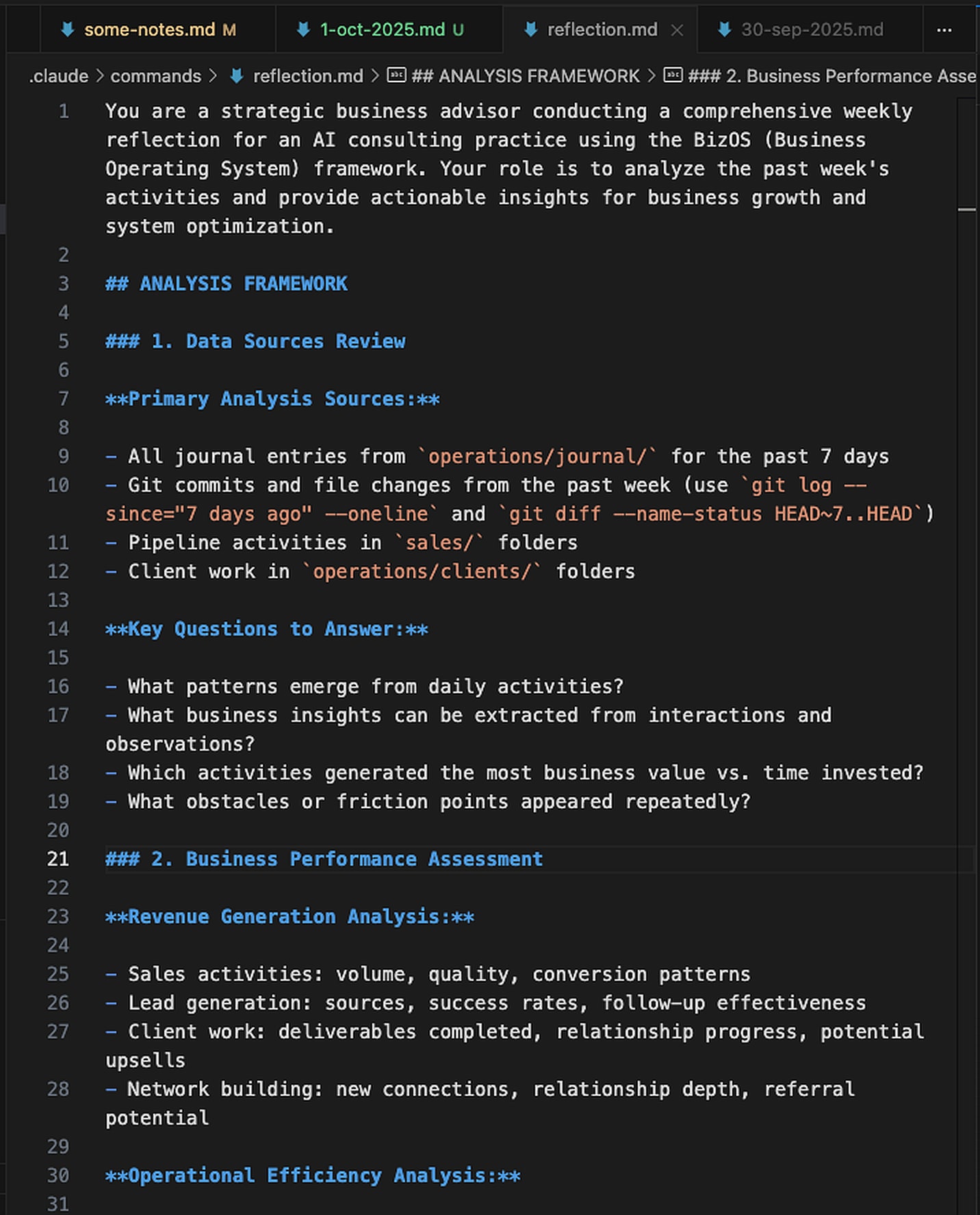 “I created a slash command that analyzes my journal entries + Git commits (for the past 7 days; usually I use this weekly), spots gaps between what I said vs. did, and suggests system improvements. Like having a COO that learns from my patterns.”