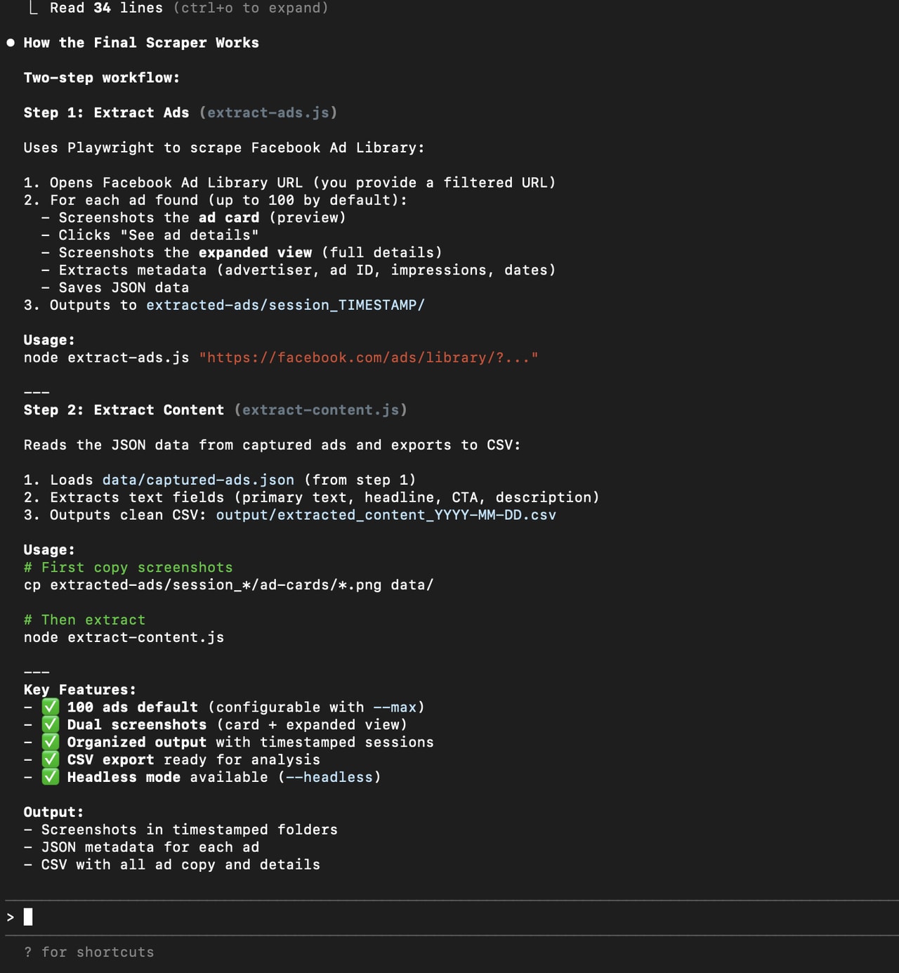 “Extract ads from competitors to find the problem, use case, or copy/asset that’s working for them, and then repurpose it for my ads. Claude Code built out these scripts that would screen-grab all ads running on the ad library, and it’s super cool to watch it navigate to the browser and grab all screenshots in an almost ‘agentic’ way.”