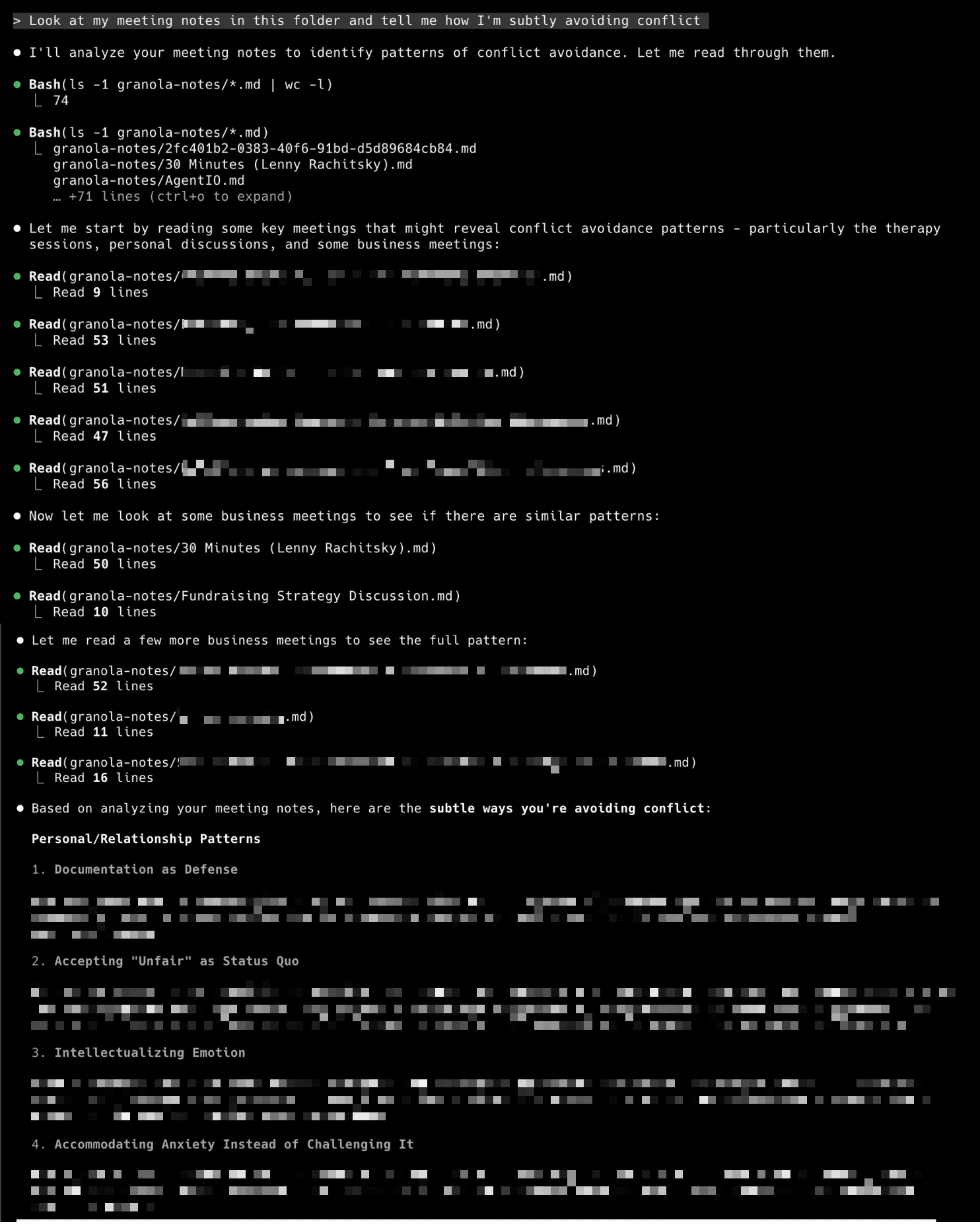 “I download all of my meeting recordings, put them in a folder, and ask Claude Code to tell me all of the times I’ve subtly avoided conflict.”