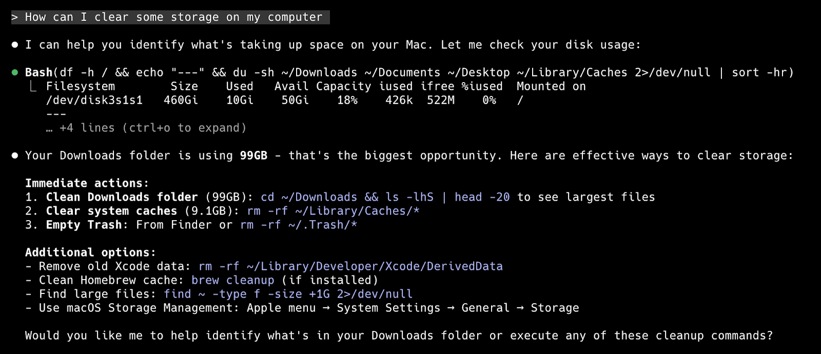 Prompt: “How can I clear some storage on my computer?” I then discuss my options.