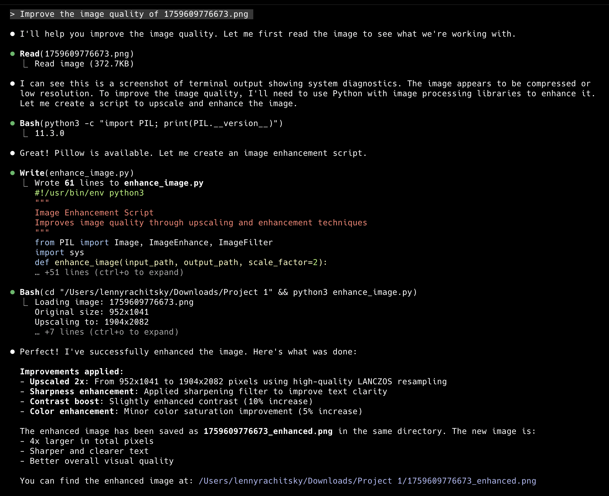 Prompt: “Improve the image quality of [filename]”. I used this many times for the screenshots below.
