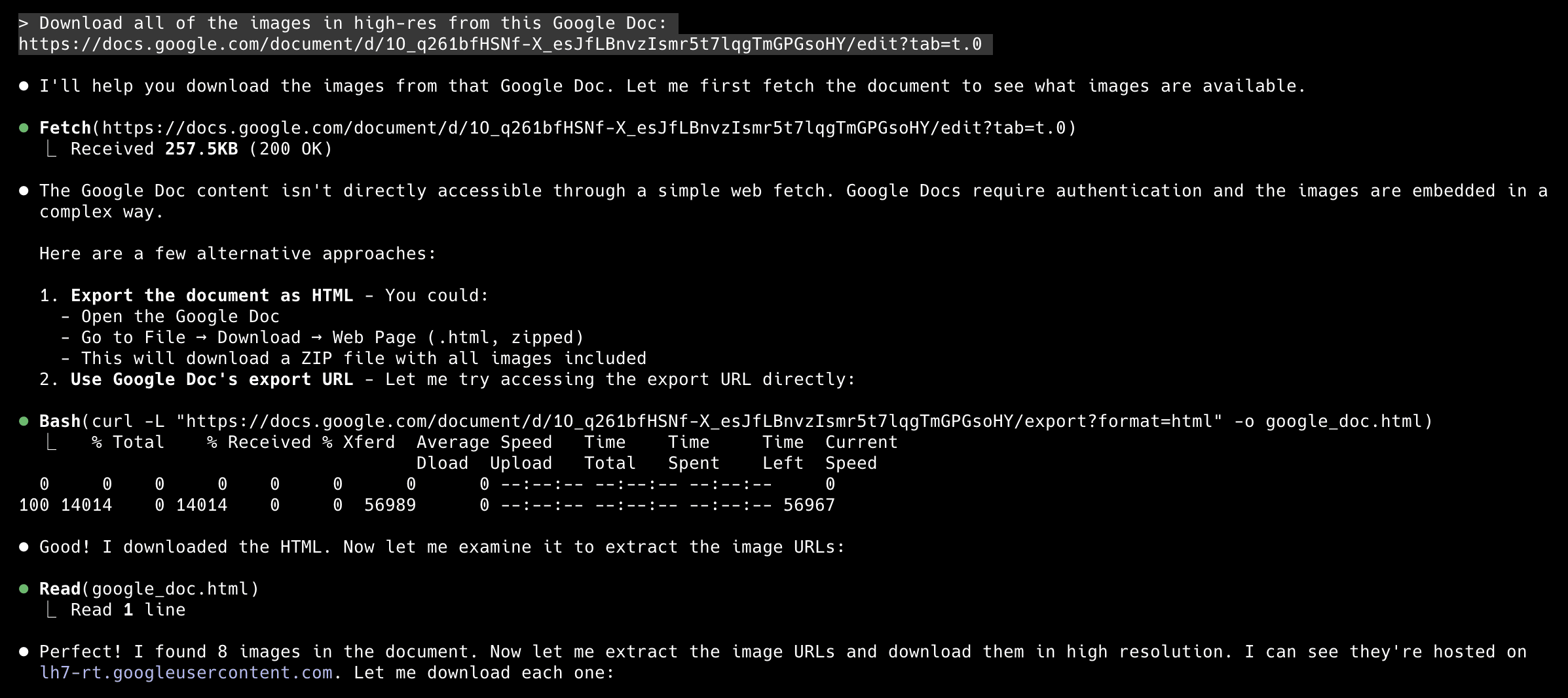 Prompt: “Download all of the images in high-res from this Google Doc: [URL]”. This paired well with item #2.