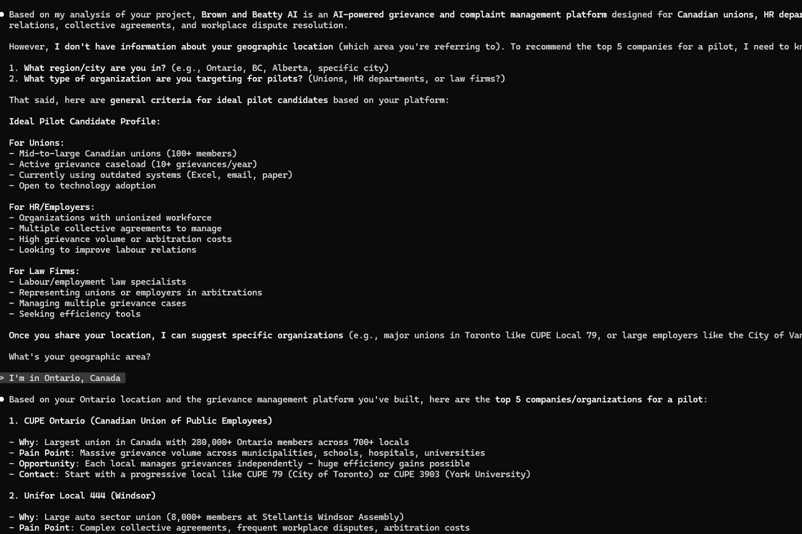 “I literally just typed: look at what I’m building and identify the top 5 companies in my area that would be good for a pilot for this. Then I go to LinkedIn and message them. If it’s not clear, I do this in the source directory of the code of my app so the first thing it does is figure out what it is that I’m building.”