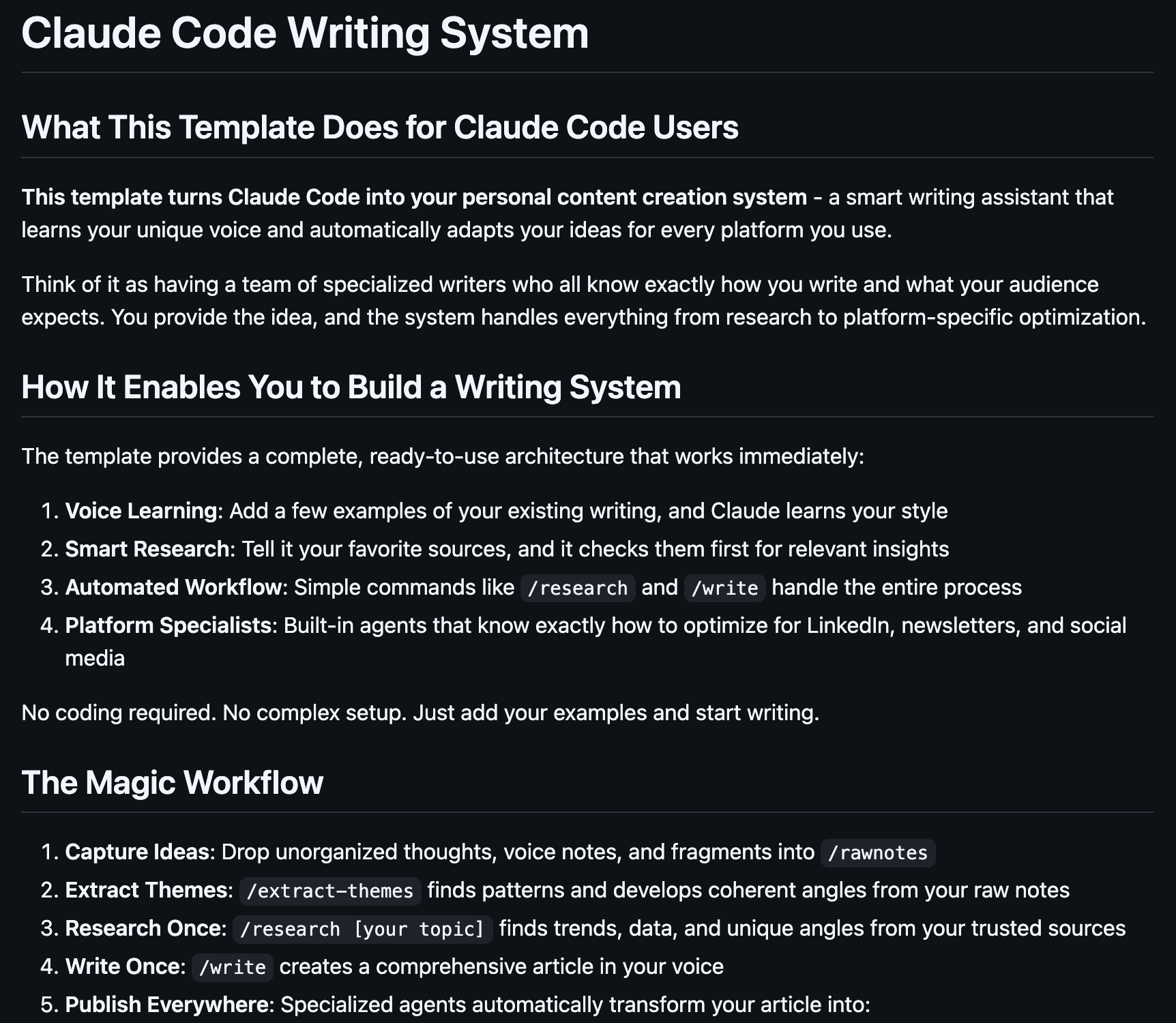 “I now write all of my content with Claude Code in VS Code. We iterate on an outline, it helps me improve the hook, it conducts research for me and adds citations to my outline, and it reviews and gives feedback on each section as I write. It has completely changed the way I write.” [Much more on Teresa’s process here]