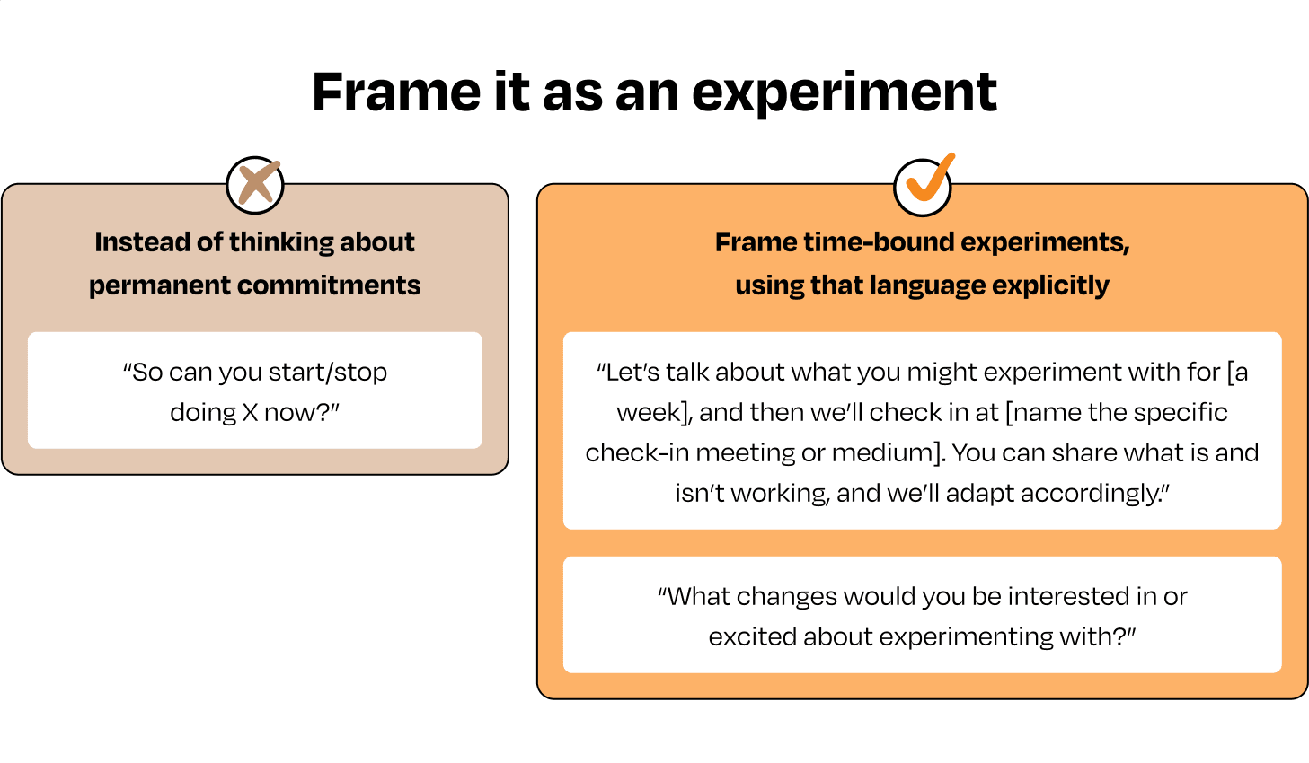 When someone is considering a new behavior, that means there’s an element of uncertainty. Understandably, there can be some hesitance about committing to do something they’ve never done before, no matter how much they follow the logic. Instead of committing to something new “forever,” explicitly acknowledge it as an experiment for a set time period.