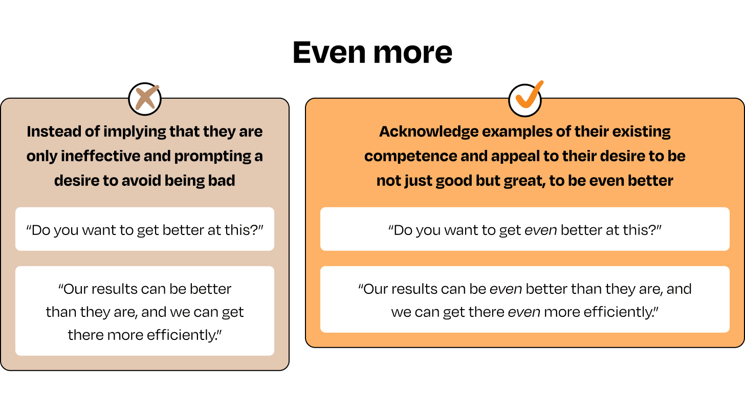 Our brains are engaged in a constant calculus: approach or avoid, friend or foe? When we frame a conversation with the potential benefits of change and acknowledge what we need to change ourselves, it sends a strong approach signal—a powerful “we’re on the same team” message—to the other party. They are then more likely to hear it as “Hey, this information can be really useful to me, and I want to help this person too.”