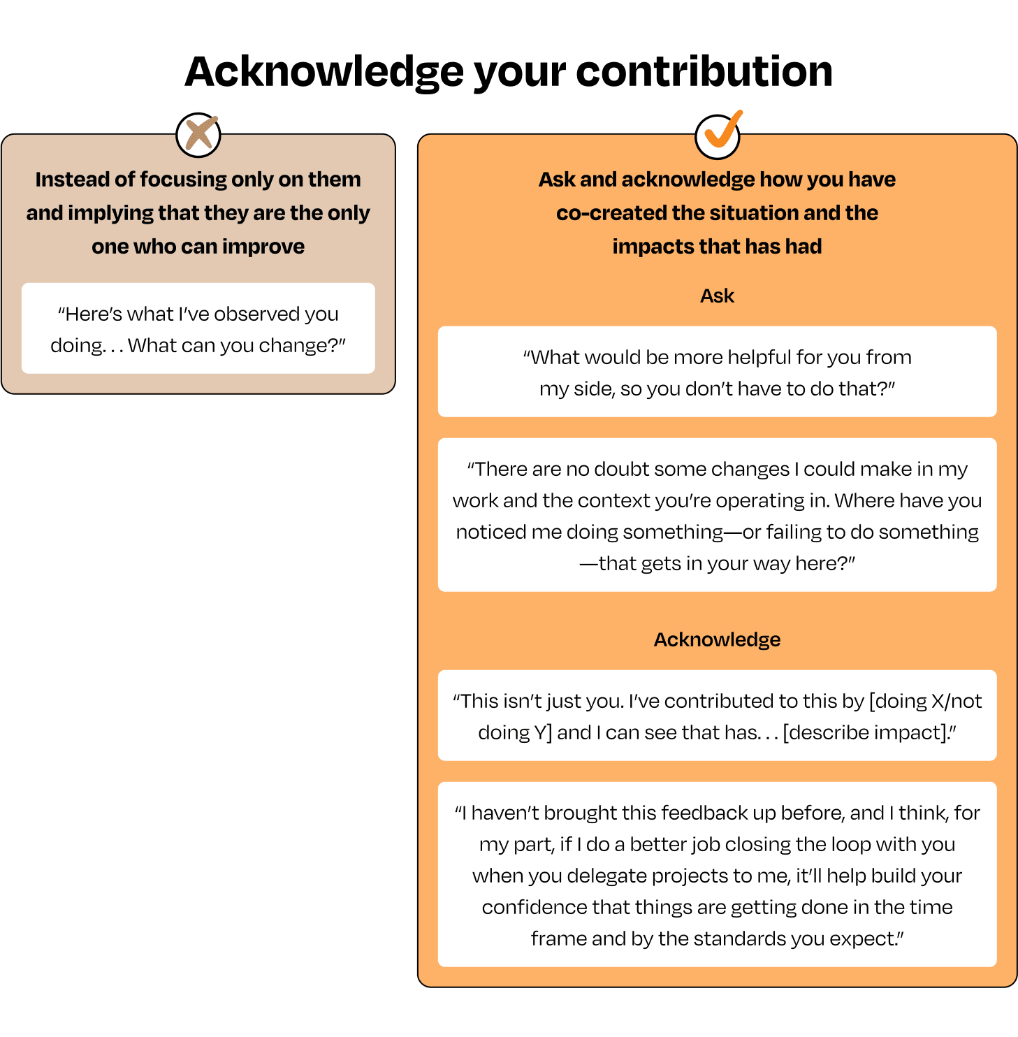 Judgments aren’t the only trigger for defensiveness. When you as the feedback giver have contributed to a situation but you aren’t noting that, the recipient’s attention can latch onto this gap. “Yeah, but what about your actions?” they wonder. You can preempt this reaction by simply and directly acknowledging your contribution.