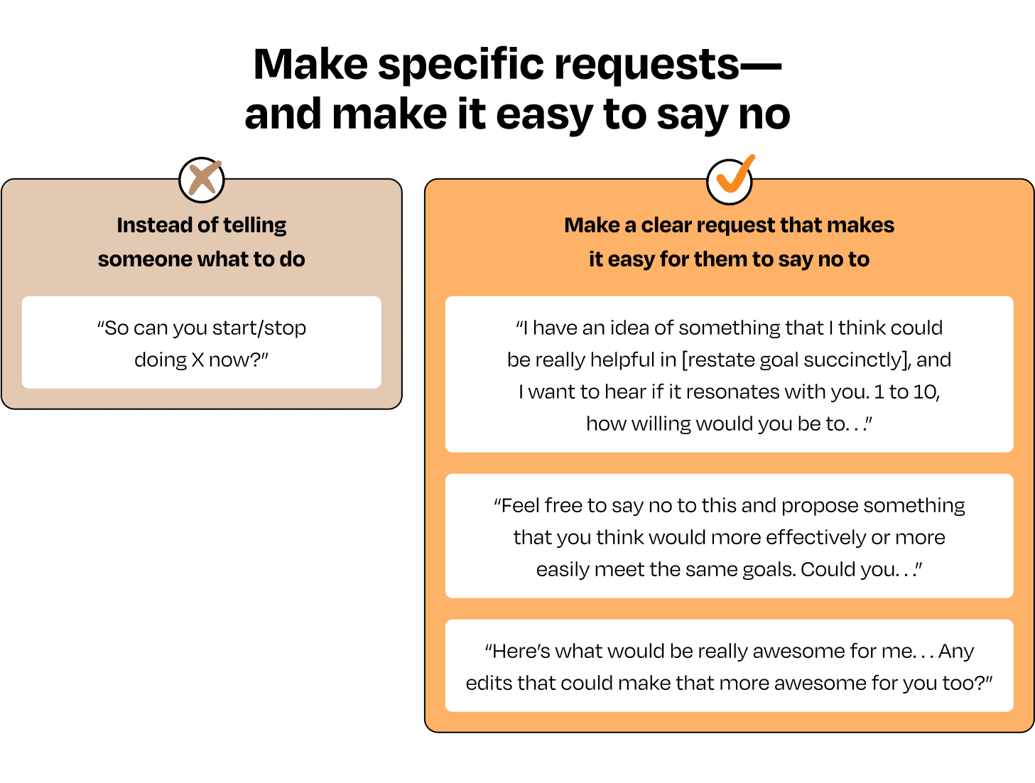 It’s also important to ensure that your specific request includes what you want more of, not just less of. As psychologist Marshall Rosenberg, the author of Nonviolent Communication, said, “You can’t do a don’t.” Otherwise, when they find themselves in the same situation again, they’ll be unclear about what alternative behavior to engage in.