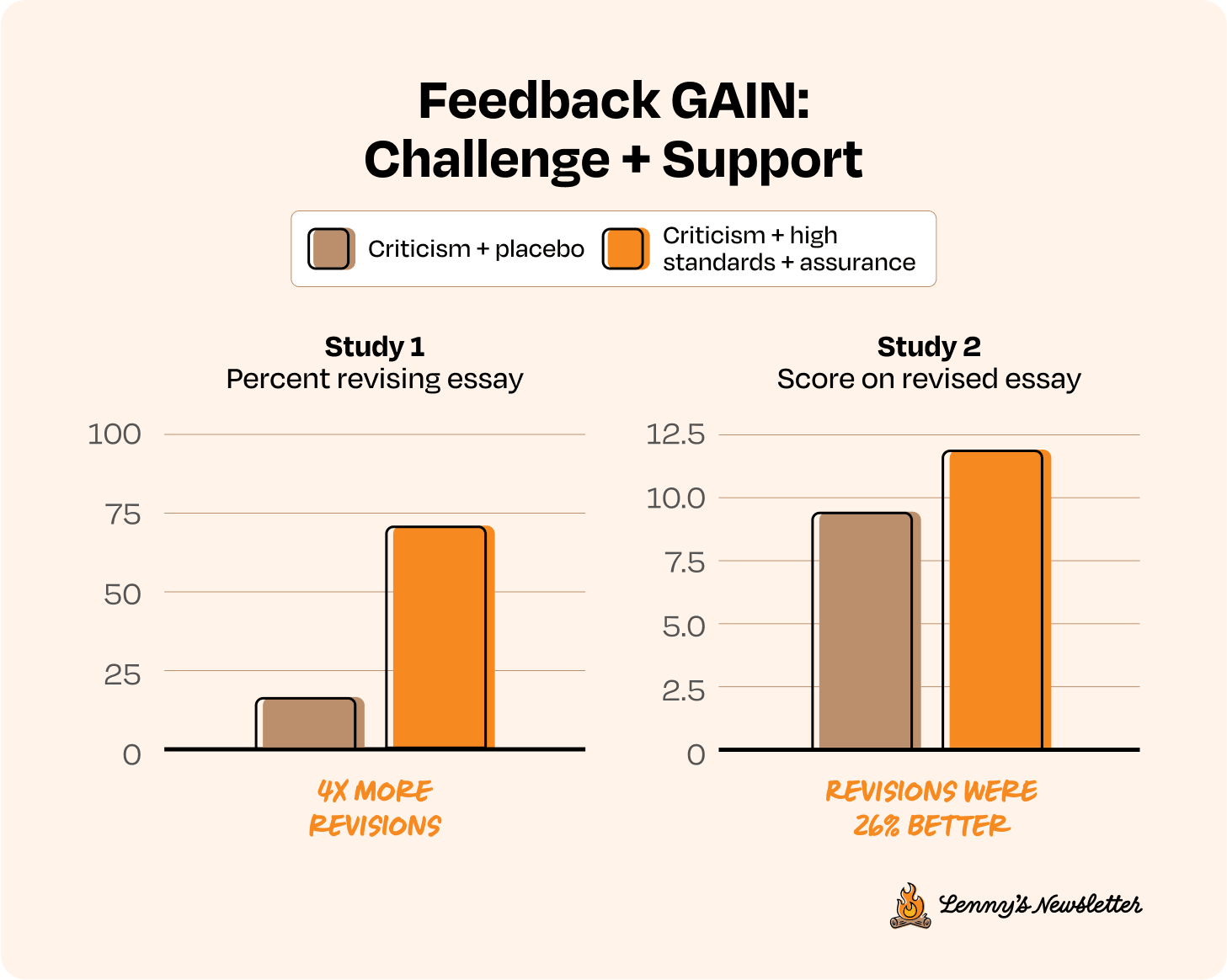 One randomized, double-blind controlled study from Stanford tested the impact of integrating these two qualities using the sentence “I’m giving you these comments because I have very high expectations [challenge] and I know that you can reach them [support].” Compared with a placebo—“I’m giving you these comments so that you’ll have feedback on your paper”—the first sentence more than quadrupled the number of revisions to the original work that one group of students did, and the revisions themselves were on average 26% better.