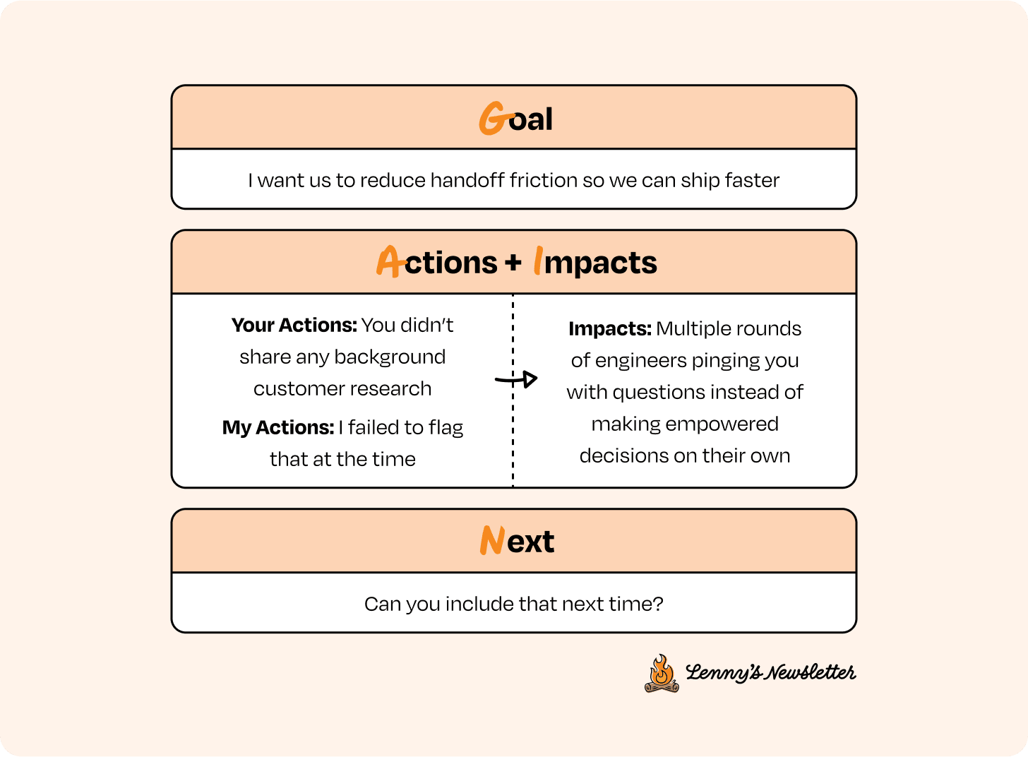We can often do this in just a few short sentences. Say an engineering lead is frustrated with a PM’s sloppy handoffs and the resulting delays. The engineering lead’s feedback to the PM might sound like: “I want us to reduce handoff friction so we can ship faster. The last handoff meeting we had, you didn’t share any background customer research, which I failed to flag at the time. Lacking that context led to multiple rounds of engineers pinging you with questions instead of making empowered decisions on their own. Can you include that next time?”