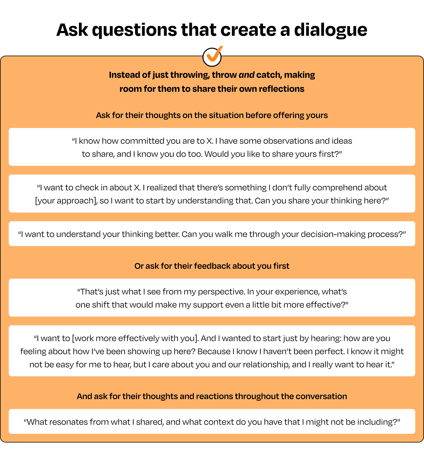 You can initiate this rhythm by pausing routinely and asking a question that elicits their reflections, reactions, and their own feedback for you. This creates two benefits: (1) it can reveal what message they are actually getting, giving you the opportunity to clarify immediately if needed, and (2), equally important, it can expand your understanding of root causes, revealing blind spots you may have (and keeping you from putting your foot in your mouth).