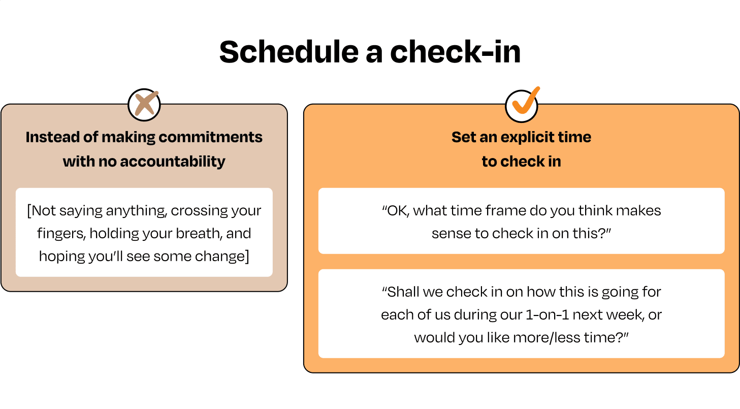 If you don’t set a clear check-in, you run the risk of not seeing the change you were hoping for and having to initiate a follow-up feedback conversation if you still want to close the gap. The discomfort of this is higher, so it’s easier to avoid, and the frustration festers into resentment and helplessness. If instead you establish a time and date to check in, you set up three more desirable possibilities: