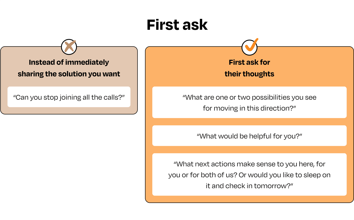 Sometimes asking for the other person’s ideas can feel disingenuous when all you want is to propose your own. In that case, share your idea, and offer it as a suggestion or a request in a way that still honors their autonomy—in other words, not as a demand.