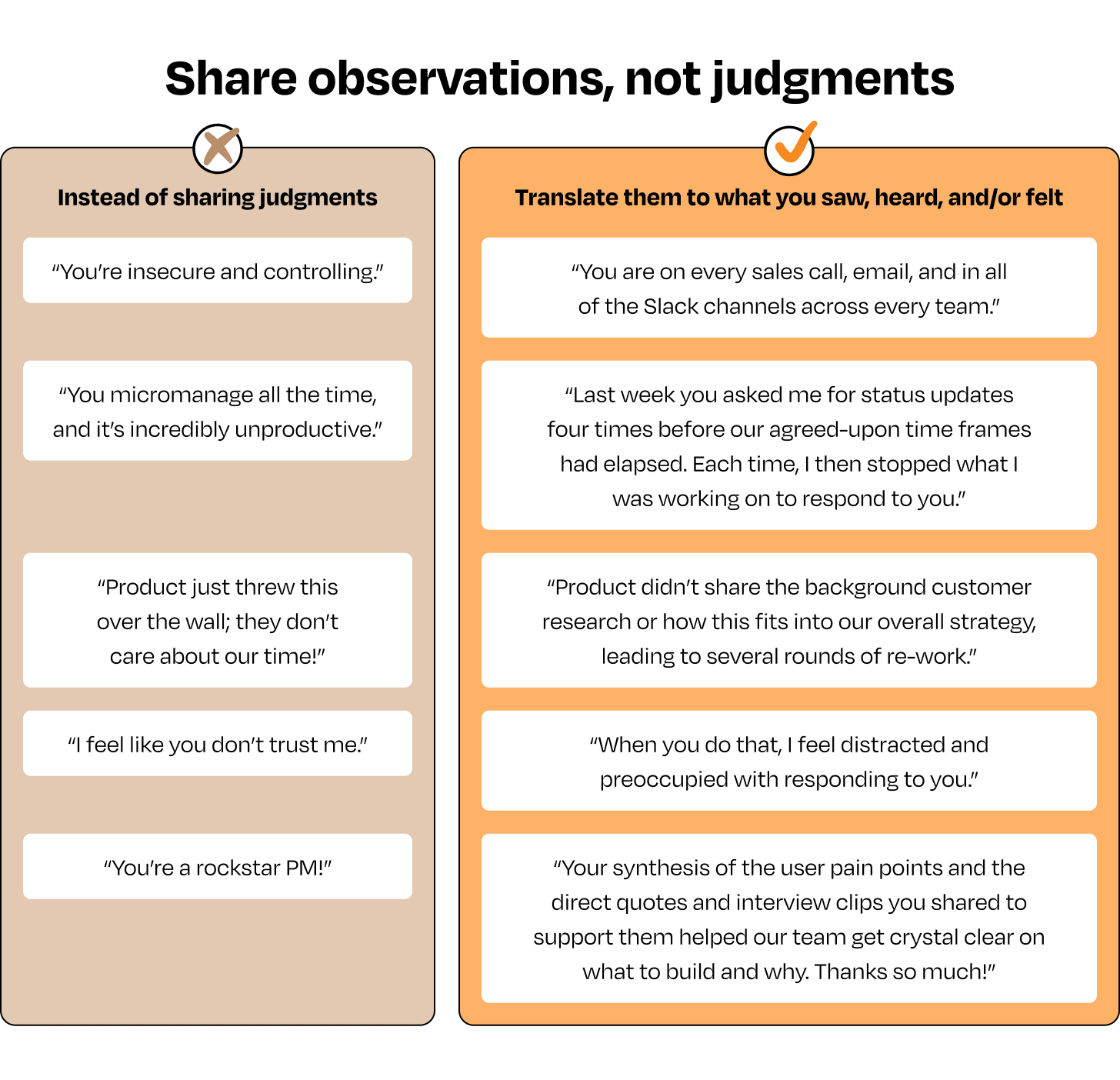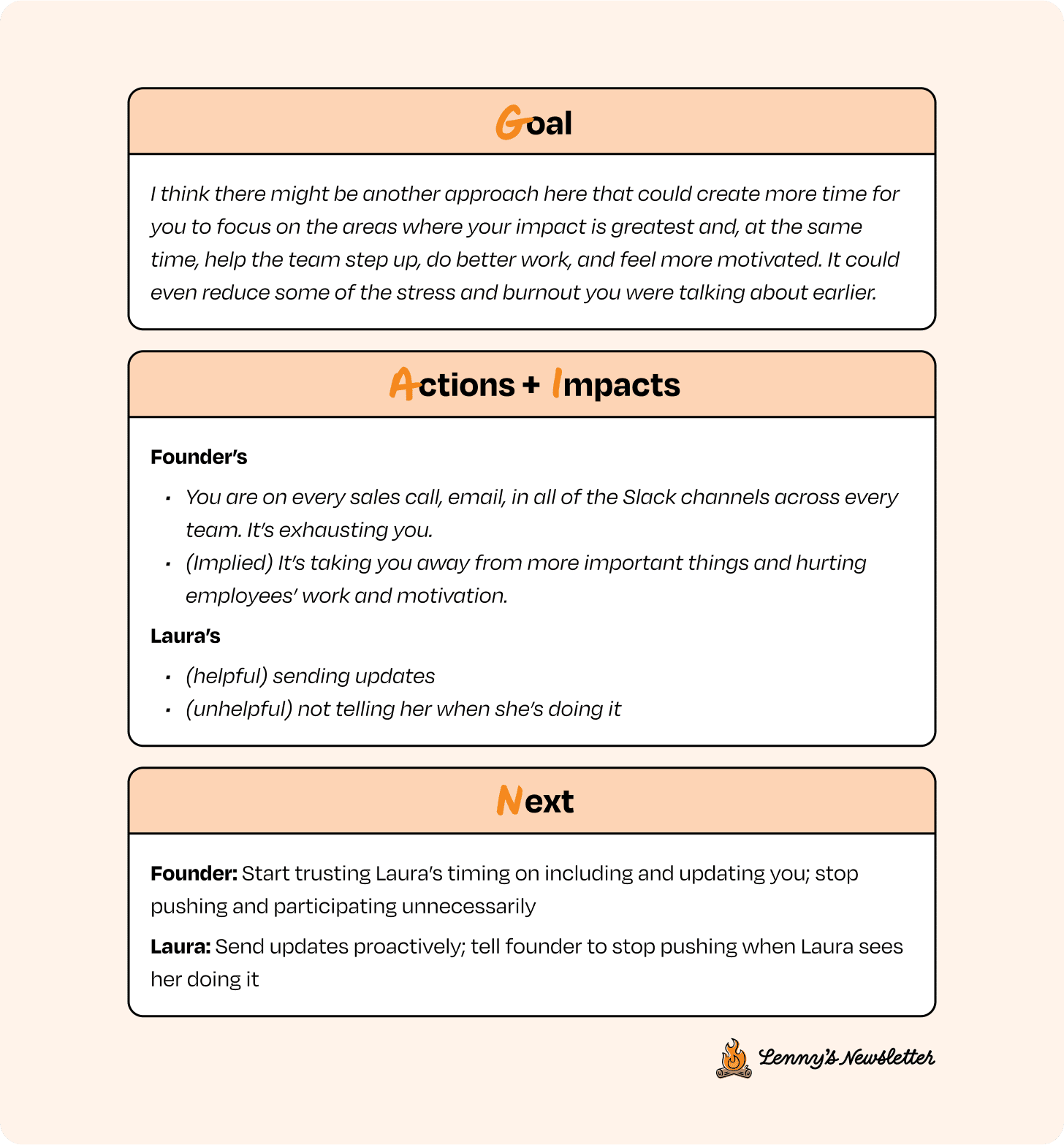 Laura never called it “micromanagement” to the founder. She didn’t even use the word “feedback”; she just described the actions and their effects as she observed them.