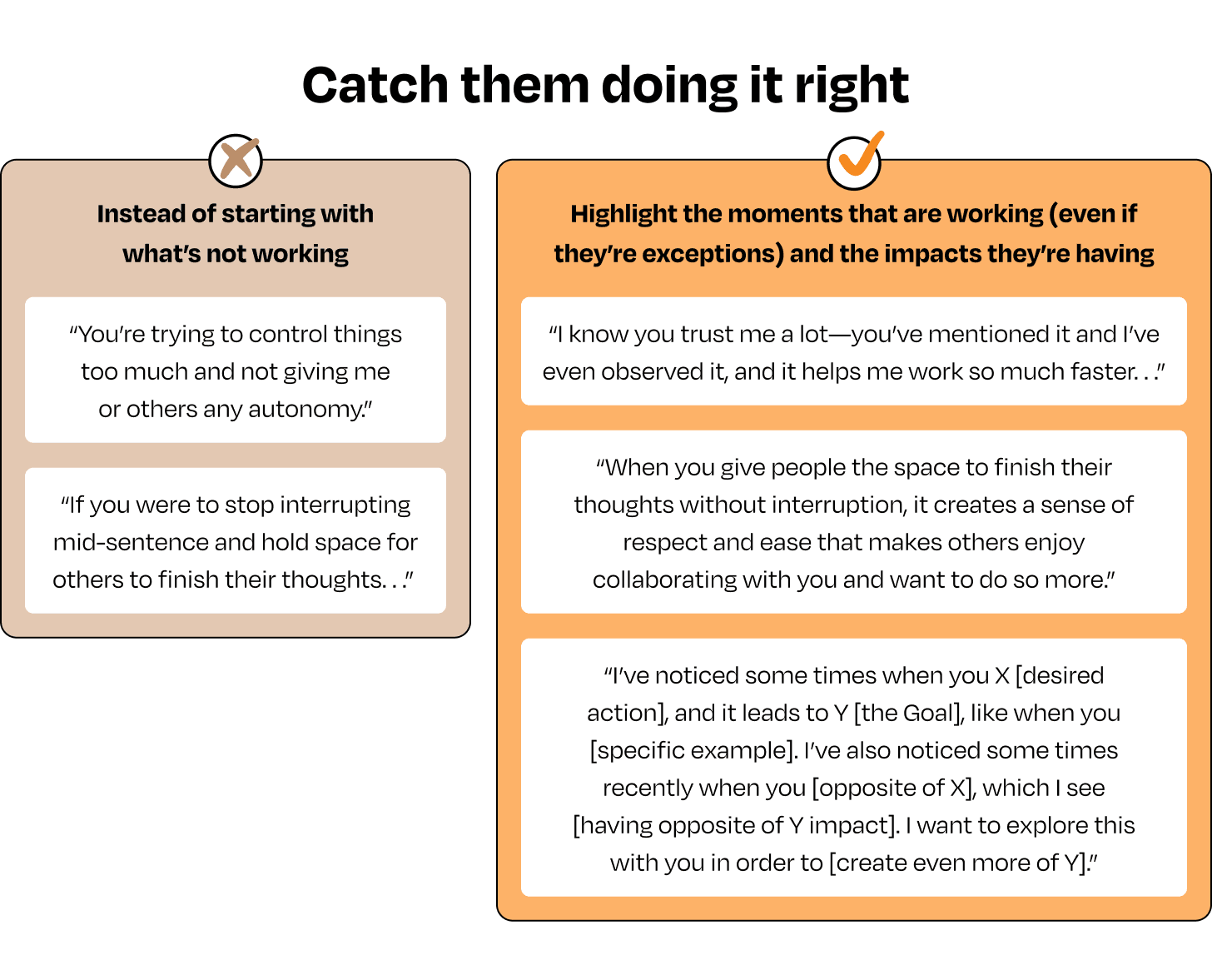 If you can find even one instance of someone already using the desired behavior, it will help them recognize what that looks and feels like. Further, they will feel more confident in their ability to act in that way. The impact of that behavior serves as the Goal for the feedback.