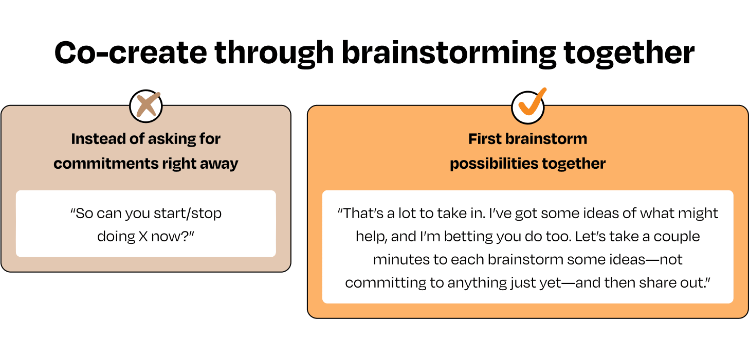Goal: “I think there might be another approach here that could create more time for you to focus on the areas where your impact is greatest and, at the same time, help the team step up, do better work, and feel more motivated. It could even reduce some of the stress and burnout you were talking about.”
