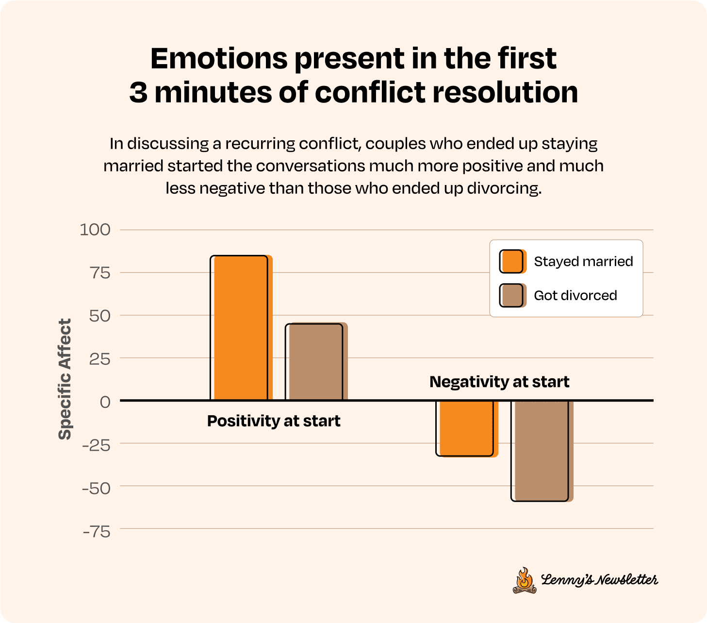 First, let’s look at communication in the most sensitive domain: marriage. Watching just three minutes of a conversation, marriage researcher John Gottman was able to predict with 93% accuracy which couples would be happy, distressed, or divorced six years down the road; most people, even couples therapists, averaged 50% accuracy. How does Gottman distinguish the relationship masters from the disasters? His meticulous research, filming couples’ conflicts and tracking the couples over years, shows that couples with long-term happy, stable relationships open conflict conversations with more positive and less negative emotions than doomed ones, especially focusing on sharing the “dream within the conflict.” Instead of just complaining, they articulate what it is they want more of and why (the Goal in GAIN). Hearing what you both want more of makes it easier to feel motivated and excited about the future rather than frustrated about what’s not working in the present. When 65% of startup failures are attributed to problems within management team dynamics, Gottman’s relationship research is also worth paying attention to at work.