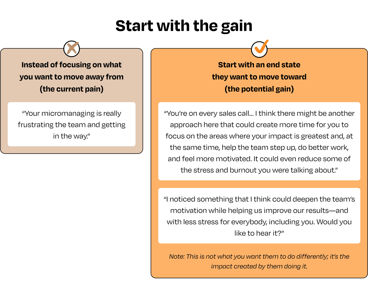 It is profoundly more effective and inspiring to frame feedback based on the experiences or results we want to move toward (the gain) instead of focusing only on what we want to move away from (the pain).