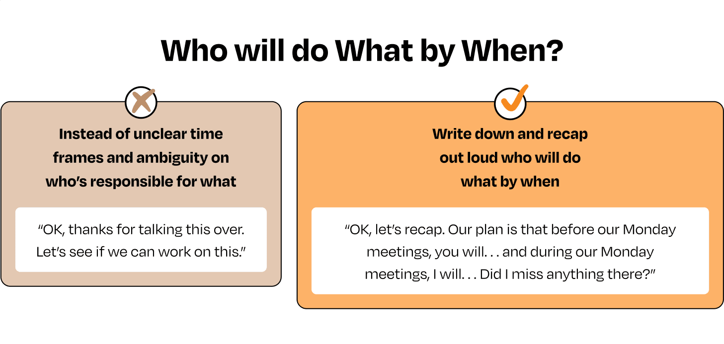 “Let’s” and “should” are insidious impostors when it comes to action items. Let’s: Is that you or me? Should: Is that an idea we’re considering or a commitment? When you hear these words, use them as an automatic signal to pause and clarify who will do what by when.