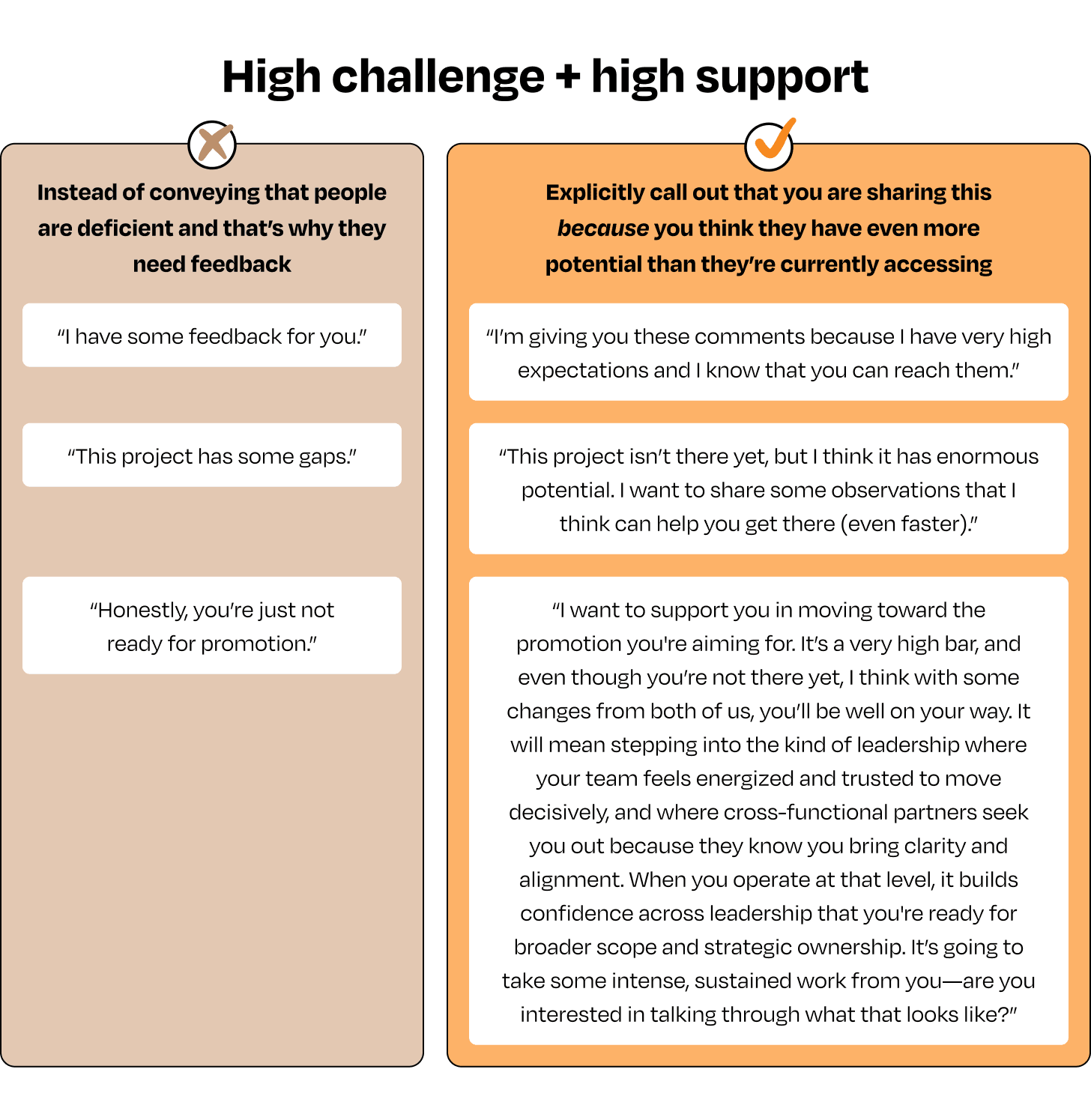 Sometimes it’s important to emphasize the “not yet,” the gap between where performance is now and where it needs to be. In those cases, we must offer both challenge and support. These qualities are usually understood as opposites (“I’m either extremely honest or extremely caring”), but that is a misconception.